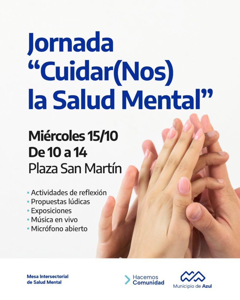 El Municipio de Azul invita a la comunidad a participar de la jornada por el Día Mundial de la Salud Mental, que se realizará el miércoles 15, de 10 a 14, en la Plaza San Martín, bajo el lema “Cuidar(Nos) la salud mental”.