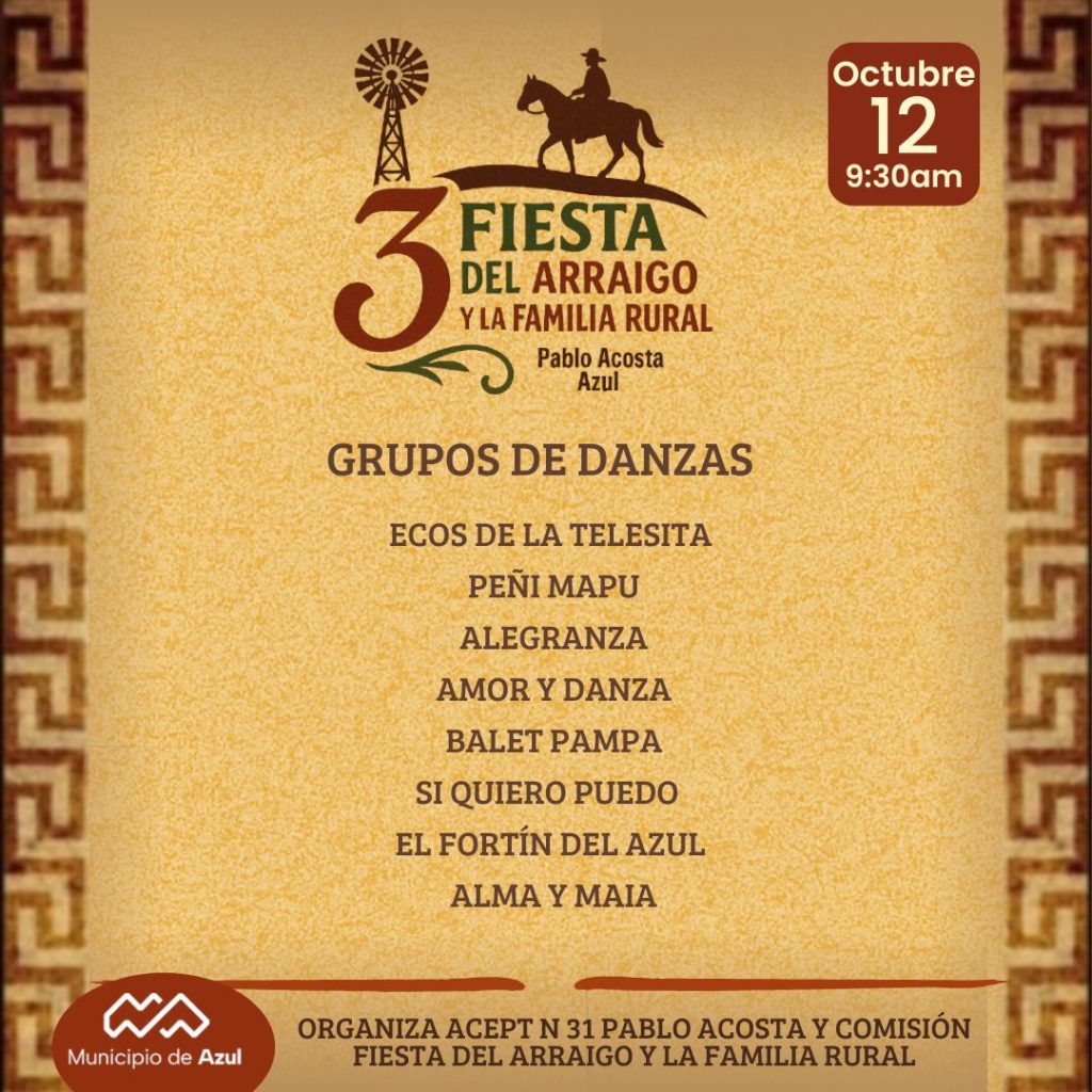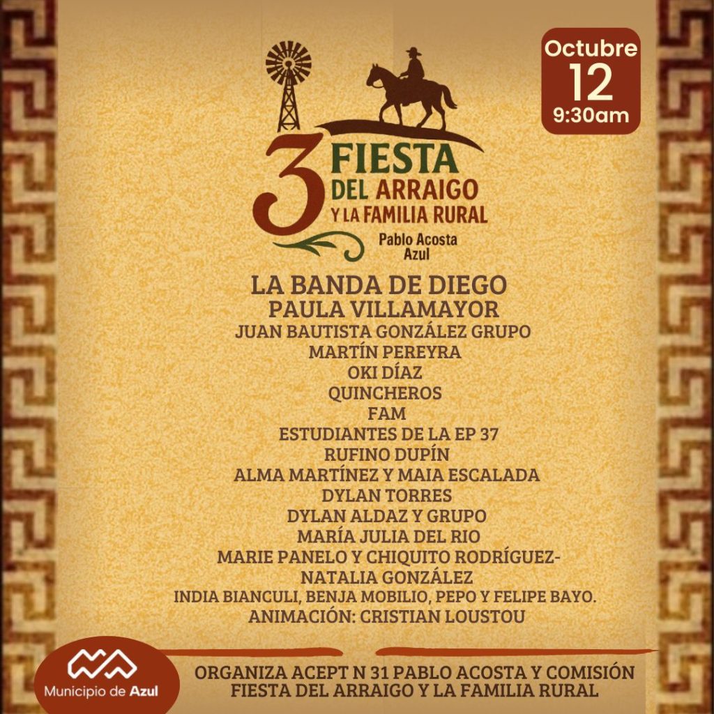 El Municipio de Azul recuerda que el próximo domingo 12 en el paraje Pablo Acosta, se realizará la 3° edición de la Fiesta del Arraigo y la Familia Rural.